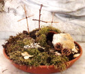 Zuerst ein kleines Stück von einem Steckschwamm mit einer Heißklebepistole in den Untersetzer kleben, die drei Kreuze aus Zweigen mit einer Schnur zusammenbinden und in den Steckschwamm stecken. Dann den Boden des Untersetzers mit etwas Sand befüllen, den Tontopf mit der Öffnung nach vorne in den Untersetzer legen und dann alles mit Moos ausgestalten. Zudem können noch Steine, Zapfen... in die Landschaft gelegt werden.